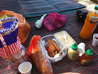 We gathered ourselves at my house about 11am, and filled our baby myvi BKE7170 with all our picnic things, mat, food and all our belonging for the day out. And pretty soon we were on the road. After driving about 1hour from Subang to Bagan Lalang, Sepang. When we reached there it was about 12pm, and the sun was on our heads. It was definitely a hot day out. We put up our tent, lay down our rattan mat and soon we started our picnic food indulgence...=).